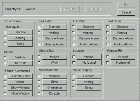 Все динамические связи можно разделить на две группы: Touch Links (левая колонка) и Display Links (три колонки справа). С помощью свойств Touch Links выполняется какой - либо ввод в систему. Свойства Display Links осуществляют вывод информации на экран дисплея.