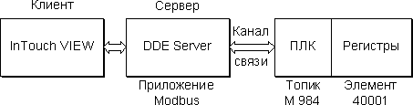 Через сервер ввода/вывода InTouch - приложение имеет возможность читать данные из контроллера или писать данные в него. Процесс обмена информацией InTouch - приложения с контроллером можно представить следующей схемой