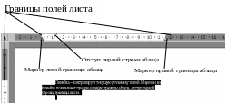Л инейка контролирует текущую установку границ листа и абзаца. Маркеры на линейке показывают правую и левую границы абзаца, отступ первой строки (красная строка), границы листа (левое, правое, верхнее и нижнее поля).