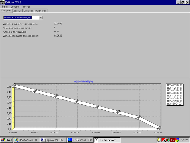 Для иллюстрации изложенных выше принципов построения СОБ, мною была написана программа Eclipse TG2. В структурной иерархии СОБ данная программа является ЛСХД с элементами ЦСХД. Программа предназначена для считывания данных тестирования с УЗК дефектоскопов и толщиномеров компании NDT Systems. Дефектоскопы серии Quantum и толщиномеры серии Nova и Eclipse, этой компании, являются многофункциональными приборами предназначенными для широкого спектра дефектоскопических исследований. Приборы имеют сходный протокол передачи данных на ПК через интерфейс RS-232, поэтому программа может работать с приборами всех указанных серий. В своей работе я использовал толщиномер модели Eclipse TG2.