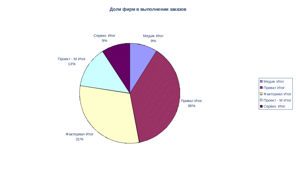 - результаты вычислений представить в виде таблицы, содержащий итоговые суммы за месяц по каждой фирме-заказчику и по фирме ООО «Инициатива», и в графическом виде;