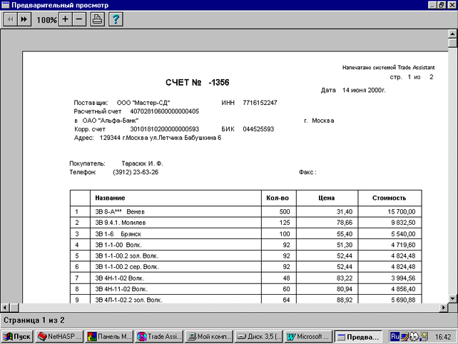 Вызывается из меню пункт "печать", где надо указать форму документа, которую требуется распечатать (счет, накладная, накладная +4%, счет-фактура, договор с юридическим лицом, с частным предпринимателем) и количество экземпляров.