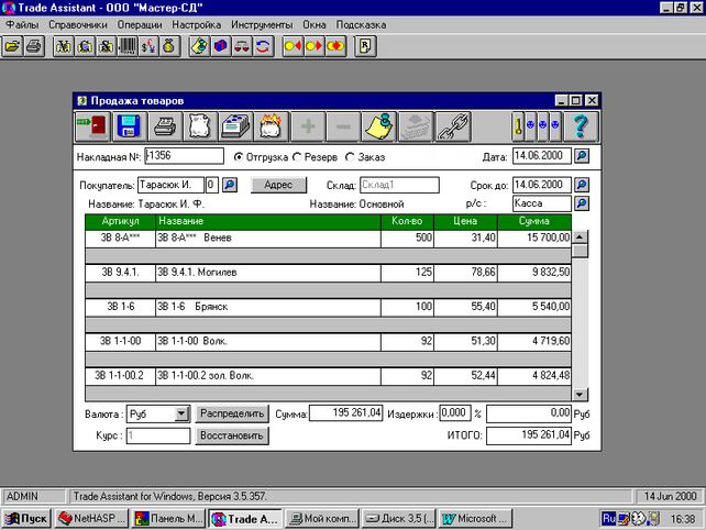 Таким образом, Trade Assistant дает возможность разными способами учитывать деньги, поступающие от плательщиков: они могут в точности соответствовать сумме отпущенных товаров или же поступать произвольными порциями, в качестве предоплаты или же оплаты уже после отгрузки товаров. На оплату накладных после отгрузки товара требуется специальная санкция Администратора. Если такой санкции нет, то при Продаже товаров система контролирует пользователя, выписывающего накладную, и следит за тем, чтобы накладные не были выписаны "в долг", т.е. при отрицательном балансе контрагента.