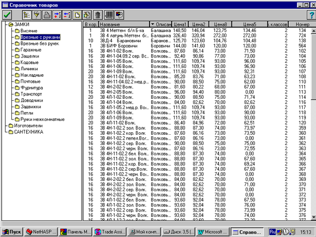 Справочник товаров содержит всю номенклатуру замков, которыми торгует данная компания. Он используется при выполнении всех товарных операций. Каждая запись справочника содержит следующие поля: артикул товара, категория товара, тип, название и описание товара, штрихкод, единица измерения и дата последней модификации записи. Кроме того, справочник содержит 8 полей для указания цен реализации товара, что дает возможность устанавливать различные цены для различных групп покупателей. Справочник товаров в ООО «Мастер-СД» подразделен на висячие замки, врезные без ручек, врезные с ручками, гаражные защелки, кодовые, личинки, накладные, почтовые, фурнитуру.