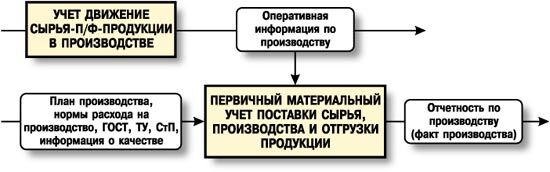 Первичный материальный учет поставки сырья, производства и отгрузки продукции.