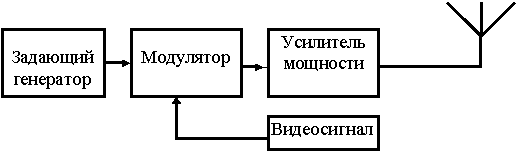 Усиленный и сформированный видео сигнал по кабелю поступает на модулятор. Одновременно на модулятор поступает высокочастотный сигнал от задающего генератора, где и происходит амплитудная модуляция видеоизображения. Сформированный таким образом высокочастотный радио сигнал, поступает на усилитель мощности и по антенно-фидерному тракту – к излучающей антенне.