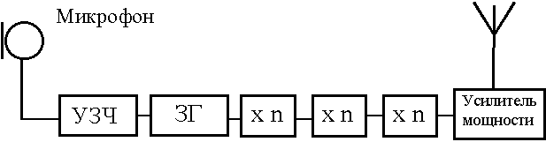 Звуковой сигнал от микрофона по кабелю поступает на усилитель звуковой частоты, где происходит его усиление достаточного для управления задающим генератором высокой частоты. Частота генератора изменяется в зависимости от звукового сигнала и далее поступает трехкаскадный умножитель, а после на усилитель мощности. Усиленный по мощности высокочастотный радиосигнал по высокочастотному кабелю поступает на антенну для излучения.