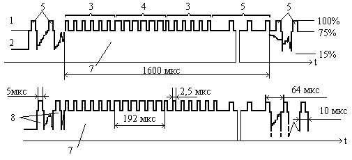 а) – четный, полукадровый импульс; б) – нечетный полукадровый импульс; 1 – уровень черного; 2 – уровень белого; 3 – уравнивающие импульсы; 4 – кадровый синхронизирующий импульс: 5 – строчные синхронизирующие импульсы; 6 – сигнал изображения; 7 – кадровый гасящий импульс; 5 – строчный гасящий импульс.