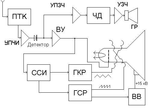 Следующий блок, подключенный к выходу видеоусилителя, селектор синхроимпульсов (ССИ). Он отделяет синхроимпульсы от видеосигнала и подает их на генератор кадровой развертки (ГКР) и строчной развертки (ГСР). Генераторы вырабатывают ток пилообразной формы, питающий отклоняющие катушки, для получения растра на экране кинескопа. Последний элемент структурной схемы - высоковольтный выпрямитель (ВВ), питающий кинескоп высоким напряжением, ускоряющим электроны. Выпрямитель присоединен к генератору строчной развертки. Так устроено питание кинескопа во всех современных телевизорах. Если вышел из строя генератор кадровой развертки, на экране видна одна горизонтальная ярко светящаяся линия: все строки сливаются в одну. Если же отказал генератор строчной развертки, на экране ничего не видно: вместе со строчной разверткой прекратилось и питание кинескопа высоким напряжением.