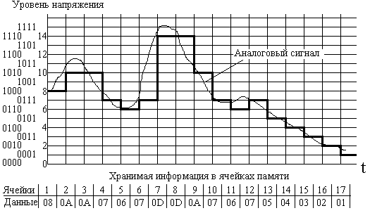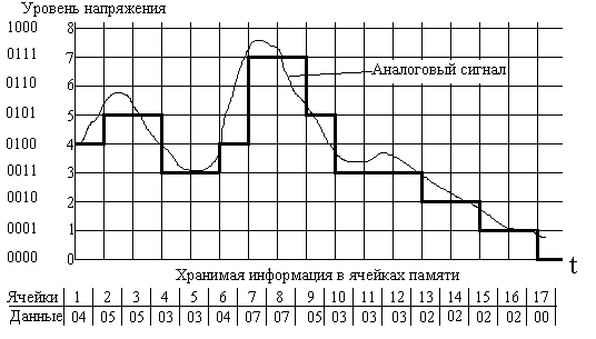Звук, музыка и человеческая речь поступает в компьютер в виде сигналов и тоже оцифровывается (Рис. 1.1 .3. Рис. 1.1 .4.), то есть превращается в числа, а потом - в байты и биты. Компьютер их хранит, обрабатывает и может воспроизвести (проиграть музыку или произнести слово).