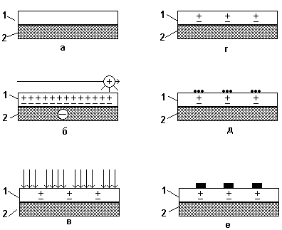 д – проявление скрытого изображения (черными кружками обозначены частицы красящего порошка);