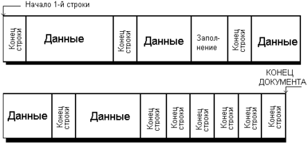 «Данные» – это последовательность кодовых комбинаций «черных» и «белых» серий одной строки изображения, расположенная в последовательности развертки строки. Код «конец строки» сопровождает комбинацию каждой строки, а также предшествует первой строке развертки. Последовательность «заполнение» (последовательность «0…0») передается между последовательностями «данные» и «конец строки» для того, чтобы время передачи строки было не менее установленного стандартом процедуры передачи. Окончание передачи страницы документа обозначается серией из шести последовательностей «конец строки».