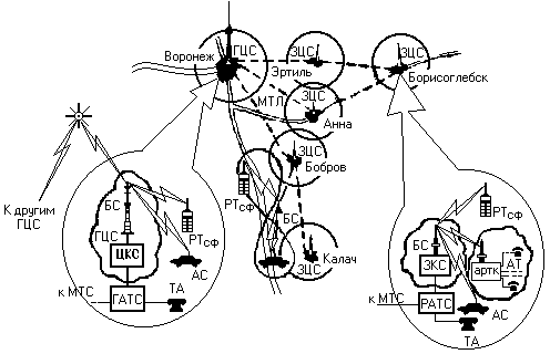 ГЦС – главная центральная станция; МСЛ– междугородная телефонная линия; ЗЦС – зоновая центральная станция; ЦКС ЗКС – центральная и зоновая коммутационные станции; ВС, AC – базовая и автомобильная станции; РТсф, ТА – радиотелефон и телефон; РАТС, РУТЛ, АРТК – радиоудлинительные станции