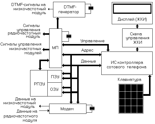 МП управляет работой контроллера сотового телефона, который представляет специализированную ИС, через которую осуществляется взаимодействие с клавиатурой и индикатором сотового телефона. Он используется также при установке необходимых частот синтезатора в радиочастотном модуле.