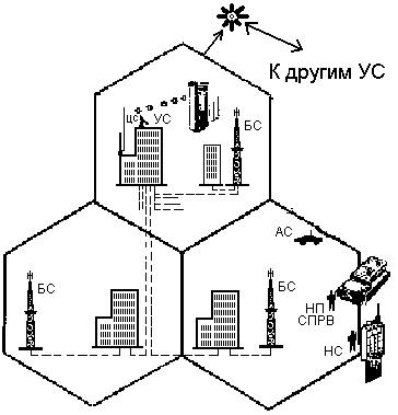 Сеть базовых станций сотовой системы через узловые станции (УС) соединена с общегосударственной телефонной сетью ОАТС. Узловая и несколько базовых станций образуют зону обслуживания. Некоторые БС одной зоны обслуживания объединяются в зону вызова подвижного абонента.