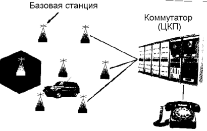 Территория страны разбивается на ячейки, подобные сотам в ульях. В центре каждой ячейки – базовая станция (БС) с радиусом действия 0,5…40 км.