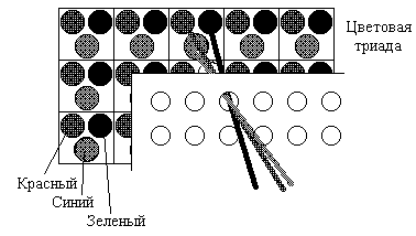 Если на изображении имеются близко расположенные цветные детали, то с большого расстояния мы не различим цвета отдельных деталей. Учитывая это свойство зрения, в электронно-лучевой трубке монитора формируется цвет одного элемента изображения из трех цветов люминофорных зерен, расположенных рядом. В соответствии с особенностями человеческого зрения в электронно-лучевой трубке цветного монитора имеются три лучевые пушки с отдельными схемами управления, а на внутреннюю поверхность экрана нанесен люминофор трех основных цветов (RGB) (Рис. 3.2 .20.).