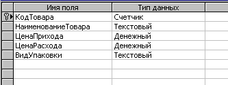 Следующим шагом будет создание таблицы в режиме конструктора, в которой будут содержаться сведения непосредственно о складе. Имя полей и типы данных, которые требуется ввести показаны на рис. 4. При сохранении зададим название таблицы "Склад".