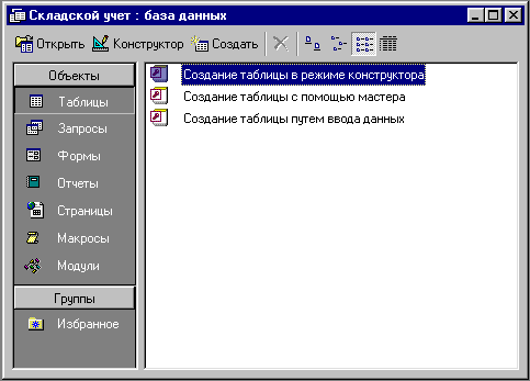 На экране появиться окно диалога "Файл новой базы данных". Здесь необходимо определить имя для нового файла и указать его местоположение на диске. Зададим название базы данных "Складской учет". Access выполнит необходимые действия, и через несколько секунд на экране появится чистое окно базы данных (рис. 2), с которым мы и будем работать.