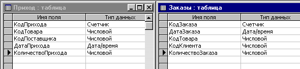 Для того чтобы учитывать движение товара на складе создадим две аналогичные таблицы (и соответственно формы к ним), которые назовем "Приход" и "Заказы". В режиме конструктора таблиц введем следующие данные (соответственно для двух таблиц), показанные на рис. 5.