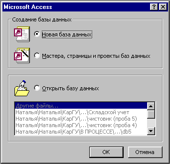 Создание базы данных – одна из простейших операций в Access. При запуске Access открывается диалоговое окно (рис. 1), в котором предлагается создать новую базу данных или открыть существующую. Выбираем параметр "Новая база данных", а затем нажмем кнопку