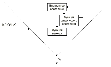 енератор потока ключей состоит из трех основных частей. Внутреннее состояние описывает текущее состояние генератора потока ключей. Два генератора потока ключей, с одинаковым ключом и одинаковым внутренним состоянием, выдают одинаковые потоки ключей. Функция выхода по внутреннему состоянию генерирует бит потока ключей. Функция следующего состояния по внутреннему состоянию генерирует новое внутреннее состояние.