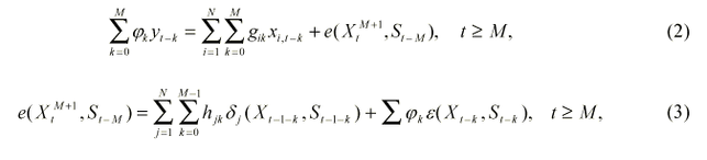 де подразумевается, что вектор состояния St-k - это функция от (Xt-k-1M-k, S t-M) для каждого 0≤k≤M-1. Линейные функции входа и выхода в (2) скоррелированы тогда и только тогда, когда функция шума e несбалансирована. Коэффициент корреляции не зависит от времени, если функция следующего состояния сбалансирована. Если это условие не удовлетворяется, то корреляционный коэффициент может зависеть от времени, поскольку от St более не требуется сбалансированность для каждого t≥0. Функция шума e в (3) определена как сумма индивидуальных шумовых функций, которые несбалансированы при условии, что сбалансирована функция следующего состояния. Поскольку от индивидуальных шумовых функций не требуется быть независимыми, в принципе нельзя исключать возможность, что коэффициент корреляции e с константной нулевой функцией равен нулю или очень близок к этому значению.