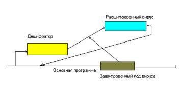 Идет выполнение программы, потом включается дешифратор, который расшифровывает вирус, затем отбрасывает вирус и опять идет исполнение кода основной программы. Код вируса в каждом случае зашифрован по разному. Если в случае нешифрованного вируса эталонное сравнение позволяет «узнать» вирус по некоторой постоянной сигнатуре, то в зашифрованном виде сигнатура не видна. При этом искать дешифратор практически невозможно, поскольку он очень маленький и детектировать такой компактный элемент бесполезно, потому что резко увеличивается количество ложных срабатываний.