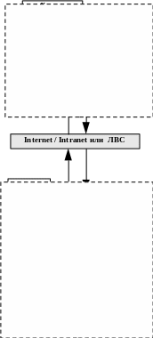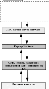 Как видно из приведённой схемы, программа может работать как с внутренними клиентами (Intranet), так и с внешними (Internet). Типичная ЭВМ, за которой автор разрабатывал и тестировал ПТК - это процессор Intel 486DX2 66 МГц, 4 Мбайт ОЗУ, жесткий диск 100 Мбайт. ОС- MS DOS 6.22 и Windows3.1
