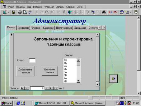 Все выше сказанное позволило остановить выбор на СУБД Access для постановки и решения задачи автоматизации процесса ведения документации и отчетности в учебном заведении.