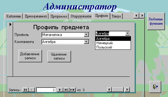 Таблица «Профили» используется для назначения общего имени группе дисциплин одной тематики. Группировка используется при планировании загрузки рабочего дня в режиме расчета Расписания и при выдаче некоторых отчетов. Нажмите на вкладку «Профили» (если необходимо, используйте значки прокрутки, находящиеся в правом верхнем углу на уровне вкладок) (рис.30). В открывшемся окне заполните поле «Профиль». Перейдите к следующему полю, расположенному правее. Щелкните по символу треугольника. В раскрывшемся списке отметьте предметы, которые входят в состав данной группы, и нажмите клавишу «ENTER». Для ввода следующей группы нажмите кнопку «Добавление записи». По окончании работы перейдите к другой вкладке или нажмите кнопку «Выход» с изображением открытой двери.
