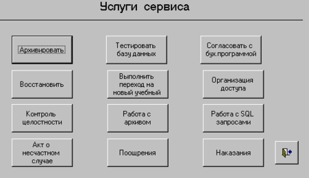 Кнопка «Сервис» (рис.35) открывает форму позволяющую выполнять некоторые сервисные работы. Так кнопка «Архивировать» создает архив базы данных на жестком диске или на дискетах, кнопка «Восстановить» – восстанавливает данные из архива в случае их разрушения на диске.