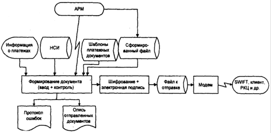 ля обеспечения взаимодействия по схеме клиент-банк у клиента устанавливается программный комплекс АРМ клиента, который позволяет вводить, редактировать платежные документы с использованием типового набора бланков, печатать подготовленные документы, шифровать и дешифровать информацию и обеспечивать авторизацию через механизм электронной подписи, отправлять и принимать документы, файлы и сообщения. В банке внутри базового блока устанавливается для взаимодействия с клиентом АРМ банка. Этот комплекс обеспечивает через АРМ коммуникаций аналогичные функции по взаимодействию с клиентом, поддерживает архивы взаимодействия с клиентом и отправляет поступившие платежные документы по ЛВС на обработку в нужный АРМ.