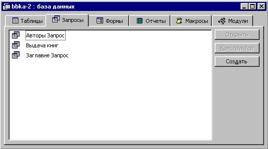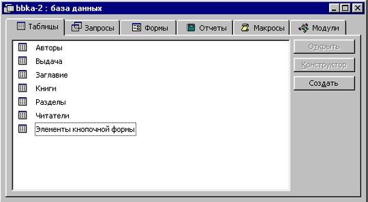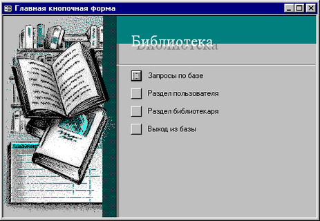 В ней собраны все необходимые запросы, формы и таблицы. Именно с ней пользователь (читатель, библиотекарь) работает, когда необходимо выполнить запрос, посмотреть список авторов и т.п.