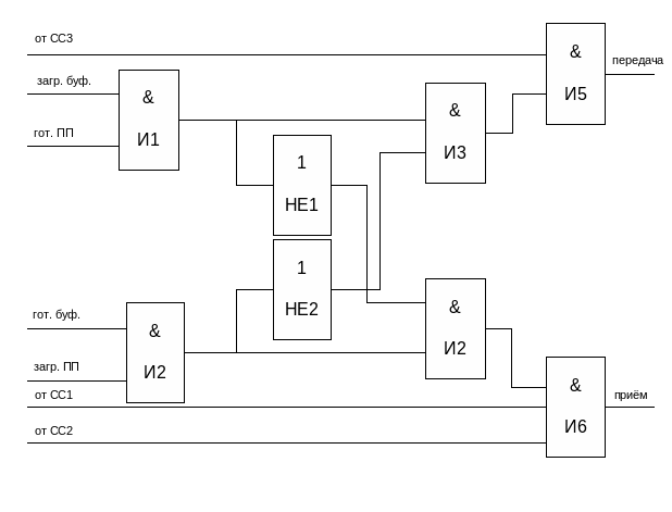 Декодер кадров (рис. 9) работает следующим образом: если станция хочет принять сигнал «готов принять» устанавливается в единицу и разрешает работу схемам сравнения СС1 и СС2. Адреса станции-отпревителя и станции-приёмника поступают на схемы сравнения СС1 и СС2, на вторые входы схем сравнения подаются адреса из блока памяти. Если А1 равен собственному адресу станции, то на выходе СС1 появляется 1. Это значит что кадр прошёл по кольцу и вернулся к станции-отправителю. Если А2 равен собственному адресу станции, то на выходе СС2 появляется 1. Это значит что кадр адресован этой станции. Если ни на одном из выходов схем сравнения не установилась 1, т.е. А1 и А2 не равны собственному адресу станции, то это значит, что кадр адресован другой станции. Сигнал «готов передать» разрешает работу схемы сравнения ССЗ, и если приоритет станции оказался наивысшим, то происходит передача пакета в моноканал.