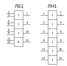 Микросхемы типа ЛЕ выполняют логическую функцию «ИЛИ-НЕ», микросхемы типа ЛН представляют собой инверторы и выполняют логическую операцию «НЕ». Их условные обозначения и цоколёвка представлены на рис.12.