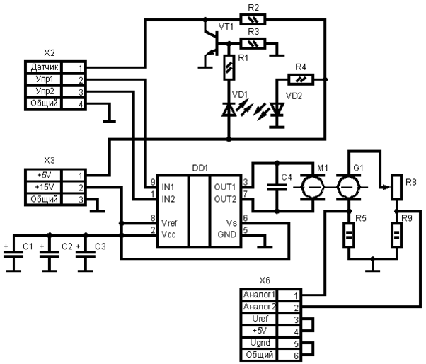 Плата двигателя рис.6.1 состоит из трех блоков: блок датчика скорости вращения, блок управления, блок датчика нагрузки. Плата двигателя подключается к разъемам портов ПМК при помощи разъемов. X2 подключается к порту Р3 и служит для соединения: оптопары («Датчик») со входом прерывания INT1, портов Р3.4 Р3.5 с входами блока управления (Упр1 и Упр2). X6 подключается к порту Р6 используя две линии AI6 и AI7 для измерения нагрузки прелагаемой к двигателю с помощью генератора (измерение нагрузки прелагаемой из вне при помощи этой схемы невозможно). Использование двух каналов предусматривается для измерения напряжения двигателя с возможным реверсом когда при вращении в одну сторону измерение происходит с первого канала, а при вращении в другую со второго. Такое распределение получается путем использования делителя напряжения общий конец которого соединен с нулевым проводом и при протекании тока в разных направлениях меняет знак напряжения на концах делителя относительно общего провода на противоположный. Опорное напряжение Uref подается соединением +5В, а нижняя граница (Ugnd) задается соединением с общим.