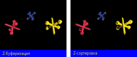 Z-сортировка (z-sorting). Z-сортировка – менее аккуратный программный метод удаления скрытых поверхностей по сравнению с z-буферизацией, также известный как алгоритм Паинтера. Объекты сортируются сзади наперед (back-to-front). Более удаленные объекты рендерятся в первую очередь, за ними следуют менее удаленные. Если объекты пересекают друг друга, то ближайший накладывается на дальнего, то есть происходит z-алиасинг.