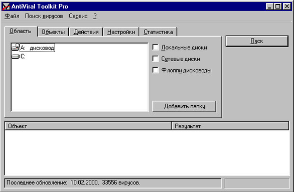 Следует отметить, программа - детектор может обнаруживать только те вирусы, которые ей известны (т.е. занесены в антивирусную базу данных этой программы). Например программа AVP Касперского способна обнаружить на 10 Февраля 2000 года 33556 вирусов. Ниже приведено диалоговое окно этой антивирусной программы. Все в ней отличается удобным и понятным интерфейсом. Программа выполнена для операционной системы Windows'95/'98/NT/3.11, что позволяет ей работать параллельно с другими приложениями.