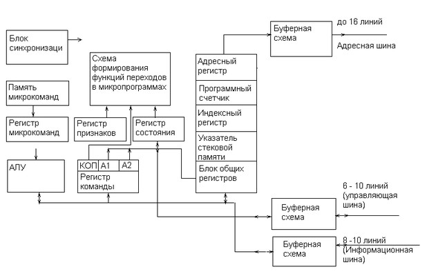 В структуре можно выделить три основные части: центральный процессор, блок управления и постоянная память микропрограмм. Центральный процессор содержит АЛУ, сверхоперативную память в виде программно доступных общих регистров и функциональные регистры – командный, индексный, адресный, указатель стека и программный счетчик. АЛУ состоит из двоичного сумматора, сдвигающего регистра, двух регистров операндов и регистра результата. Схемы АЛУ выполняют команды сложения, вычитания, логическое И, ИЛИ, сложение по модулю 2 и сдвигов. Более сложные операции реализуются программно. Блок микропрограммного управления содержит дешифратор кода операции, схему формирования функций перехода к следующему адресу в микропрограмме и регистр адреса микрокоманды. Система прерывания в микропроцессорах достаточно проста и предназначена только для восприятия прерываний от внешних источников. Микропроцессоры имеют упрощенные схемы управления ПУ. В значительной степени управление этими устройствами реализуется посредством микропрограммного управления. Блок постоянной памяти микропрограмм, реализующих команды микропроцессора, обычно выполняется в виде отдельной БИС. В микропроцессорах используют косвенную, непосредственную, индексную адресации основной оперативной памяти и прямую адресацию общих регистров. Сверхоперативная память на общих регистрах, позволяет сократить количество обращений к внешней памяти и уменьшить необходимое количество выводов корпуса за счет сокращения формата команды. Из-за ограниченного числа выводов корпуса БИС не удается реализовать интерфейс микропроцессора с высокой пропускной способностью. Поэтому микропроцессоры имеют так называемый общий интерфейс, обслуживающий как внешнюю оперативную память, так и ПУ. Если не удается выделить для интерфейса достаточное количество выводов, применяют мультиплексирование шин (использование шин для разных целей на основе разделения времени). Для обеспечения совместной работы микропроцессора и внешнего оборудования шины интерфейса снабжаются буферными схемами, в которых используются электронные схемы с тремя состояниями и спец. линии управления выдачи данных.