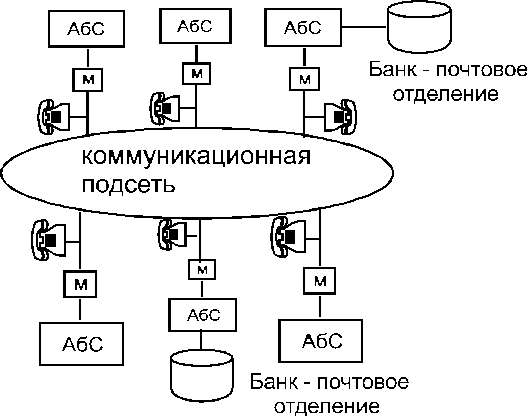 В больших информационных сетях наличие одного почтового отделения приводит к большой загрузке каналов передачи данных, ведущих к нему. Поэтому в таких сетях делают по несколько почтовых отделений (рис.6.6). Здесь АбС первоначально пересылают корреспонденцию в ближайшие почтовые отделения, которые пересылают в нужных случаях документы друг другу и рассылают их пользователям.