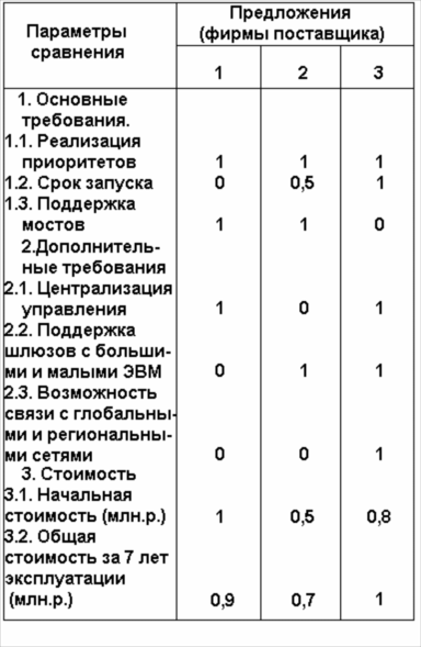Как видно из табл.7.1 ни одно предложение не опережает остальные по всем показателям. В приведенном примере предложение 2 наилучшее по Основным требованиям, предложение 3 - по Дополнительным требованиям, предложение 1 - по Стоимости.