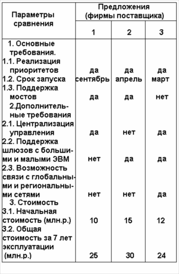 В табл.7.1 приведен ряд предложений поставщиков согласно требованиям, которые могут быть предъявлены заказчиком(см. табл. 7.1).