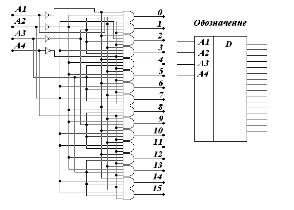 ис. 6.6. Схема четырехразрядного дешифратора.