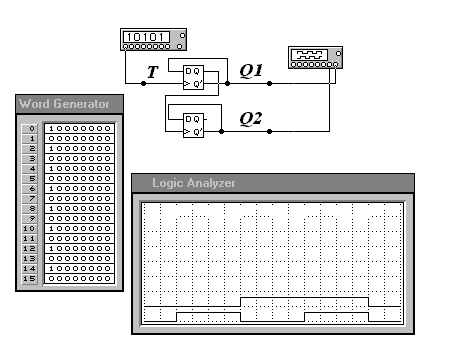 Принцип работы данной схемы заключается в следующем, при подаче первого импульса на вход схемы (Т) входной триггер переходит в состояние, когда на выходе Q действует логический ноль, при этом на инверсном выходе образуется логическая единица, поступающая на вход D. Следовательно, при поступлении следующего импульса логическая единица на входе D «перебросит» триггер в состояние, когда на выходе Q начинает действовать логическая единица, запускающая второй триггер, который работает аналогичным образом. Таким образом, на выходах схемы формируется последовательность двоичных чисел (см. осциллограммы на рис. 7.2), сначала 00, затем 01, затем 10 и, наконец, 11; после поступления следующего импульса на вход Т, на выходе снова образуется 00.