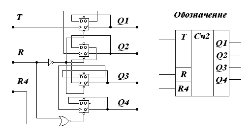При необходимости увеличить разрядность счетчика можно, добавляя в схему новые триггеры (таким образом строятся схемы на 3, 4 и более разрядов), но иногда возникает необходимость сбросить не все выходы счетчика, а лишь один разряд. Такую схему можно построить, добавив элемент ИЛИ-НЕ, подключенный к триггеру обслуживающему заданный разряд. Рассмотрим схему четырехразрядного счетчика, с возможностью сброса четвертого разряда. Схема такого устройства представлена на рисунке 6.4.