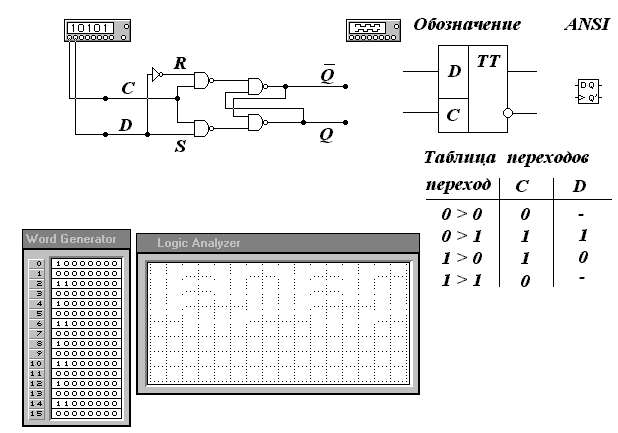 Рассмотрим принцип работы триггера, его схема содержит два входа: один информационный (D), а другой синхронизирующий (C). При подаче логического нуля на вход С, как видно из осциллограмм, состояние триггера не изменяется, т.к. сигнал не проходит через элементы И-НЕ на входе схемы, и следовательно состояние триггера не изменяется. При подаче на вход С напряжения логической единицы, поступающий на вход D сигнал изменит состояние триггера, т.к. на один из входных элементов И-НЕ поступит единица. При поступлении логической единицы на вход D (на входе С действует напряжение логической единицы), триггер перейдет в состояние, когда на выходе Q действует напряжение логической единицы; а при поступлении логического нуля триггер перейдет в состояние, когда на выходе Q действует напряжение логического нуля.