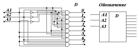 Схема работает следующим образом, при поступлении кодовой комбинации (от 000 до 111) на вход ищется совпадение (при помощи схем И) и на соответствующий выход поступает напряжение логической единицы. Инверторы требуются для преобразования кодовых комбинаций, содержащих логические нули.
