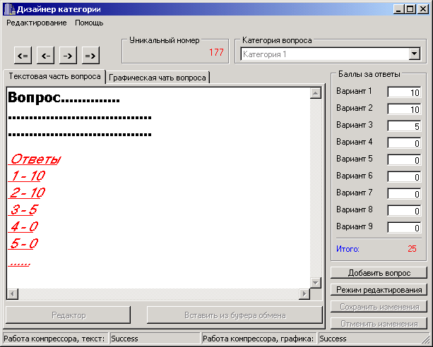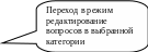 В этом режиме можно свободно перемещаться по базе вопросов. Для того чтобы внести изменения в текстовую или графическую часть вопроса, изменить количество баллов за ответ или категорию вопроса, необходимо перейти в режим редактирования вопроса. Для перехода обратно, в режим перемещения по базе вопросов, необходимо либо сохранить сделанные изменения, либо отменить их.