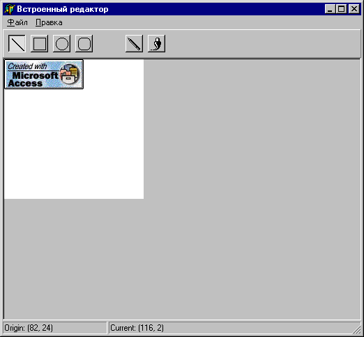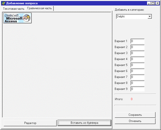 Для редактирования вопросов предусмотрен редактор – графической части , который предлагает стандартные графические примитивы для подготовки графической части вопроса ,если возможностей этого редактора не достаточно, можно выполнить редактирование в любом текстовом и графическом редакторе, а затем перенести подготовленные части через стандартный буфер обмена. На рисунке 10.2.4 представлен интерфейс встроенного графического редактора.